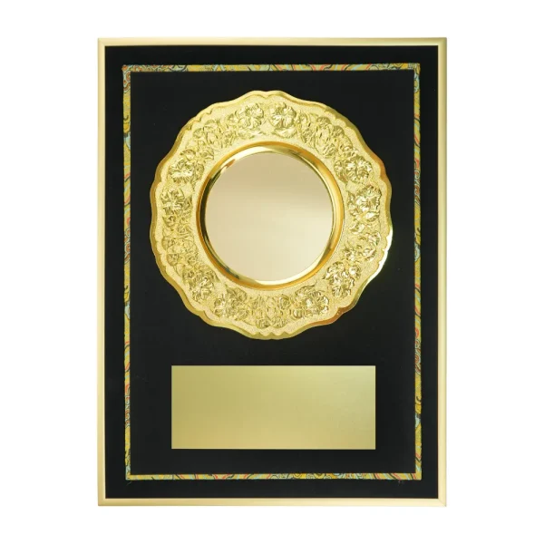 - Features: Black Velvet (Top), Round Engraved Design on Gold Metal Plate, Backside Stand