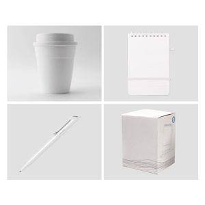 - Gift set with pen, cup, and notepad.